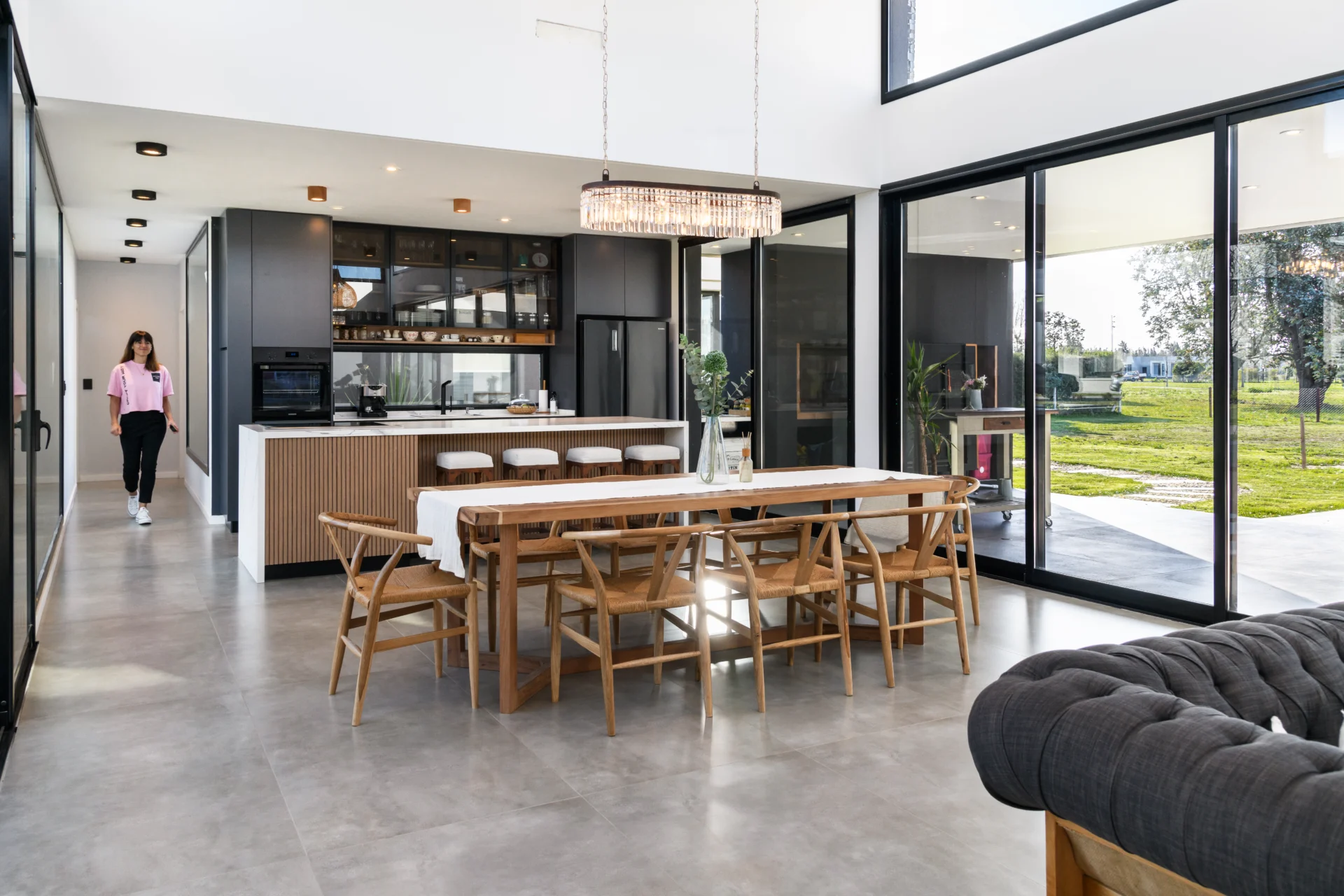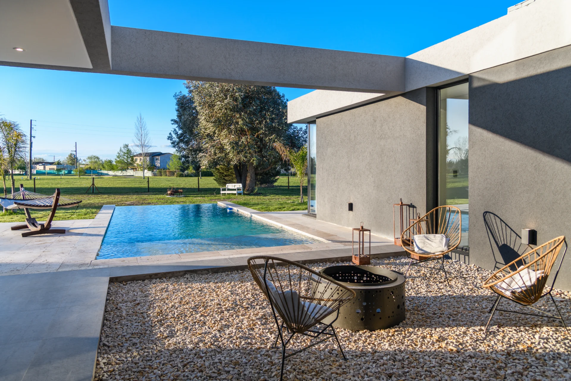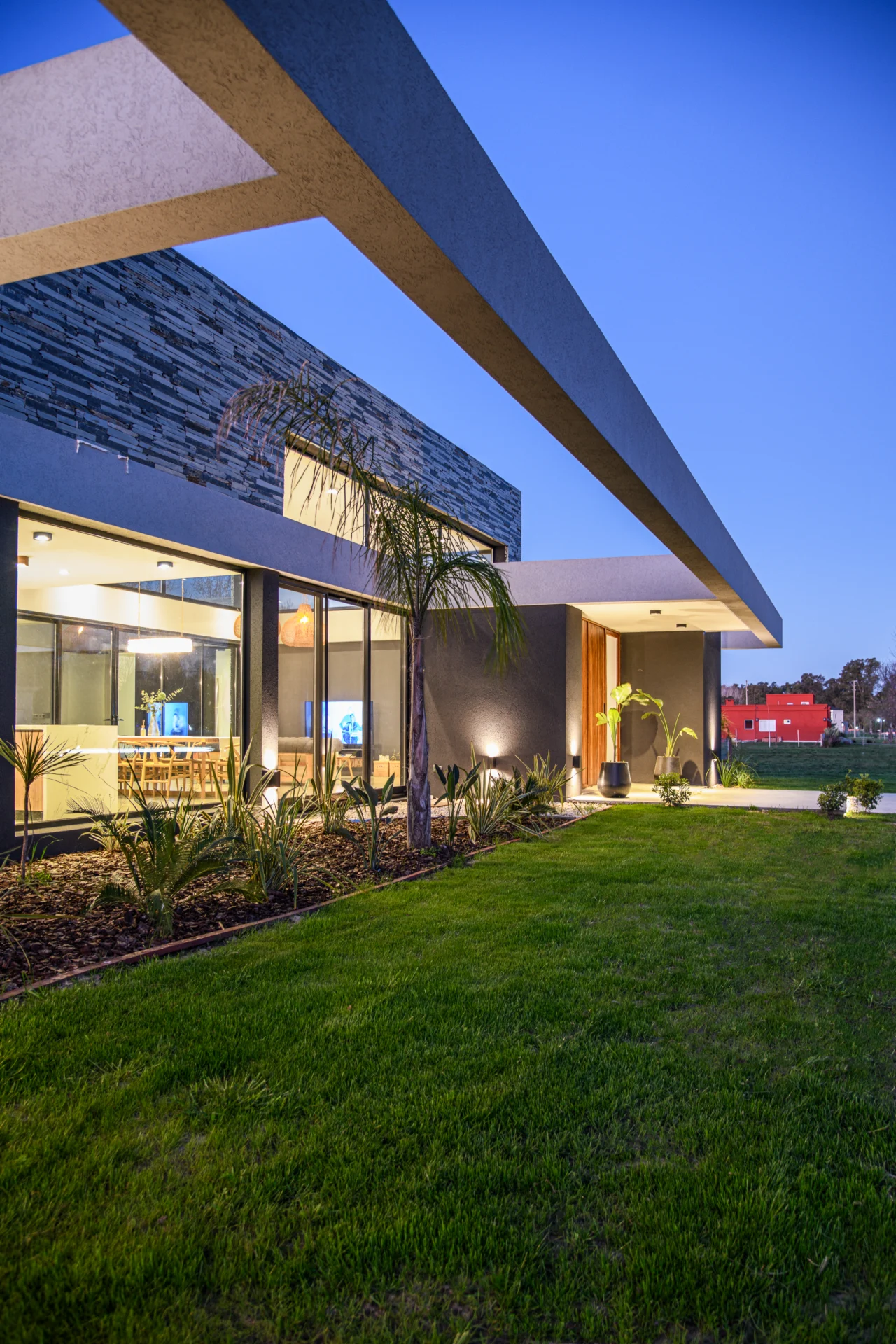 Un proyecto desarrollado en un barrio caracterizado por terrenos amplios de 50 x 50 metros, lo que permitió explorar una propuesta de diseño que combina funcionalidad, integración con el entorno y evocaciones de la vida cotidiana de su propietaria. El diseño parte de una interpretación contemporánea de la clásica distribución de casa con volumen central y dos alas, pero evoluciona hacia un concepto más abierto y fluido que prioriza la conexión con el exterior.