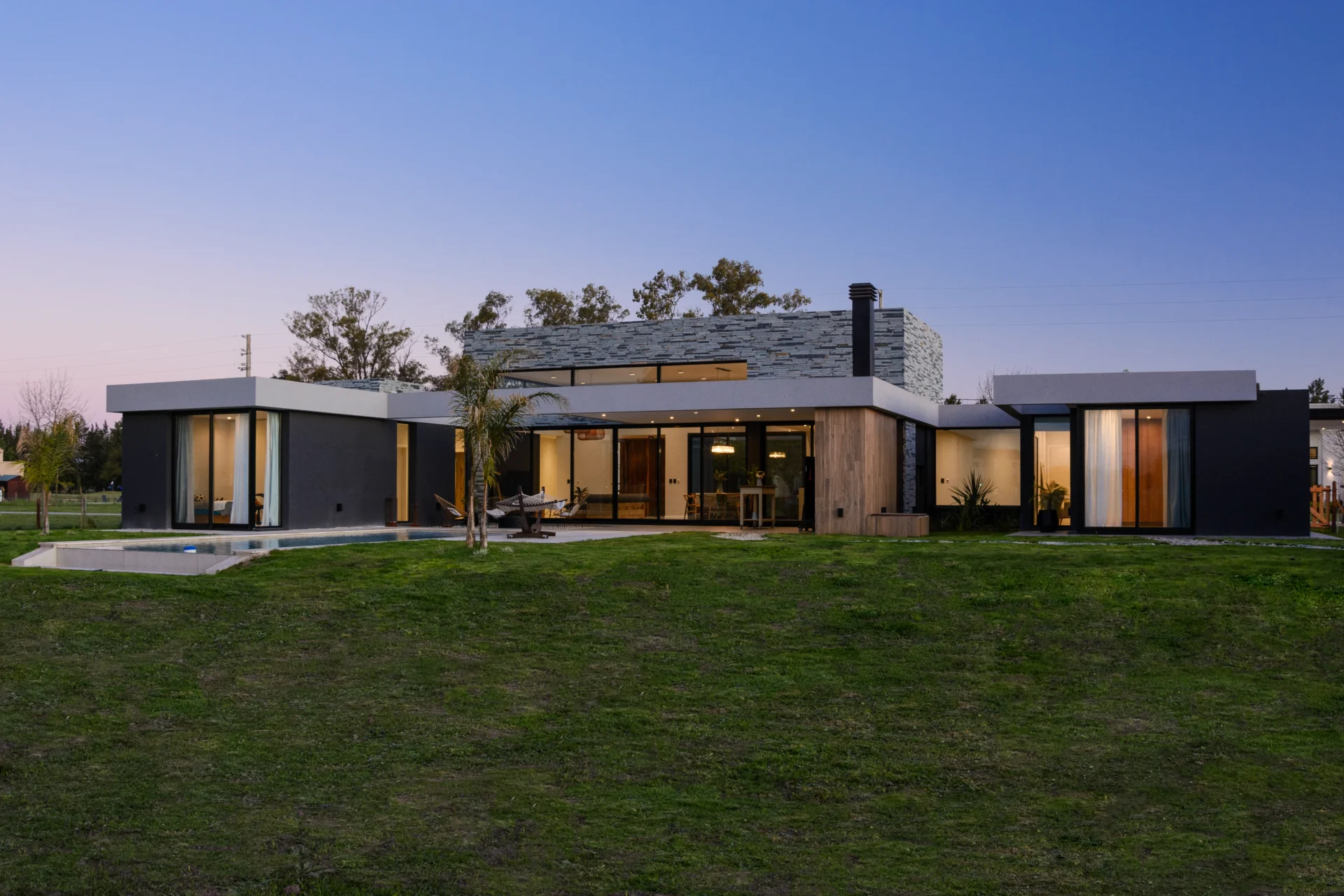 El proyecto combina materiales que enfatizan la calidez y modernidad, incluyendo revestimientos de piedra, madera y paredes negras. Los cerramientos acristalados refuerzan la sensación de amplitud y conexión exterior, mientras que los volúmenes de madera aportan textura y contrastan con la continuidad de la viga.