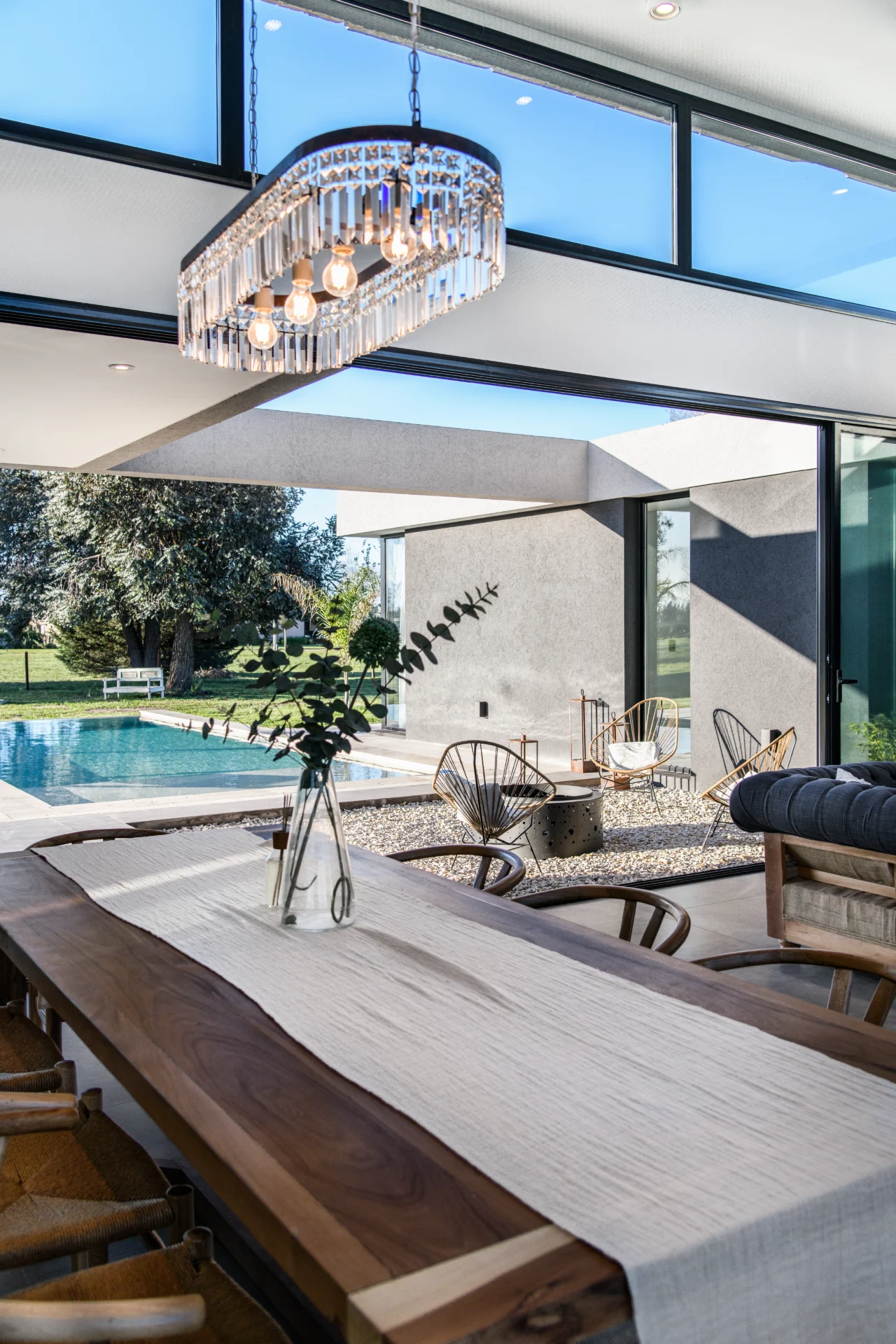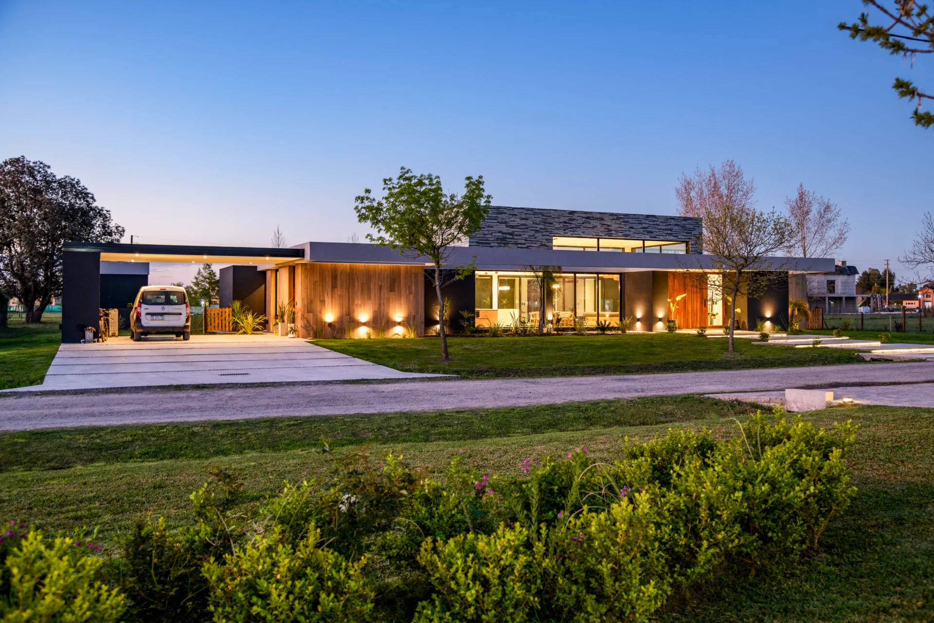 Un proyecto desarrollado en un barrio caracterizado por terrenos amplios de 50 x 50 metros, lo que permitió explorar una propuesta de diseño que combina funcionalidad, integración con el entorno y evocaciones de la vida cotidiana de su propietaria. El diseño parte de una interpretación contemporánea de la clásica distribución de casa con volumen central y dos alas, pero evoluciona hacia un concepto más abierto y fluido que prioriza la conexión con el exterior.