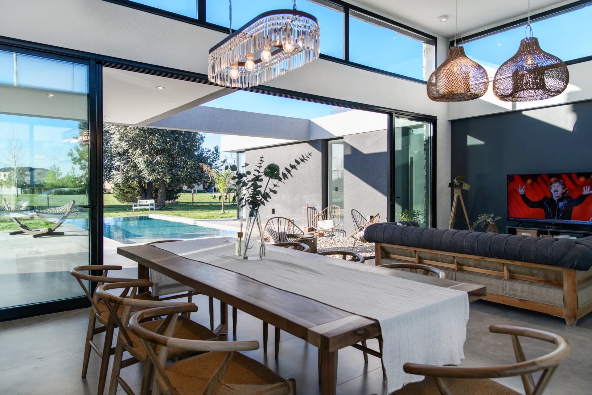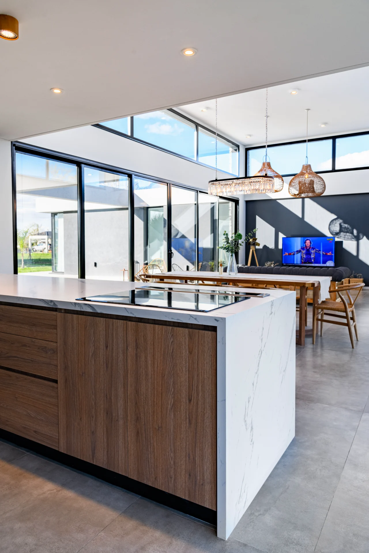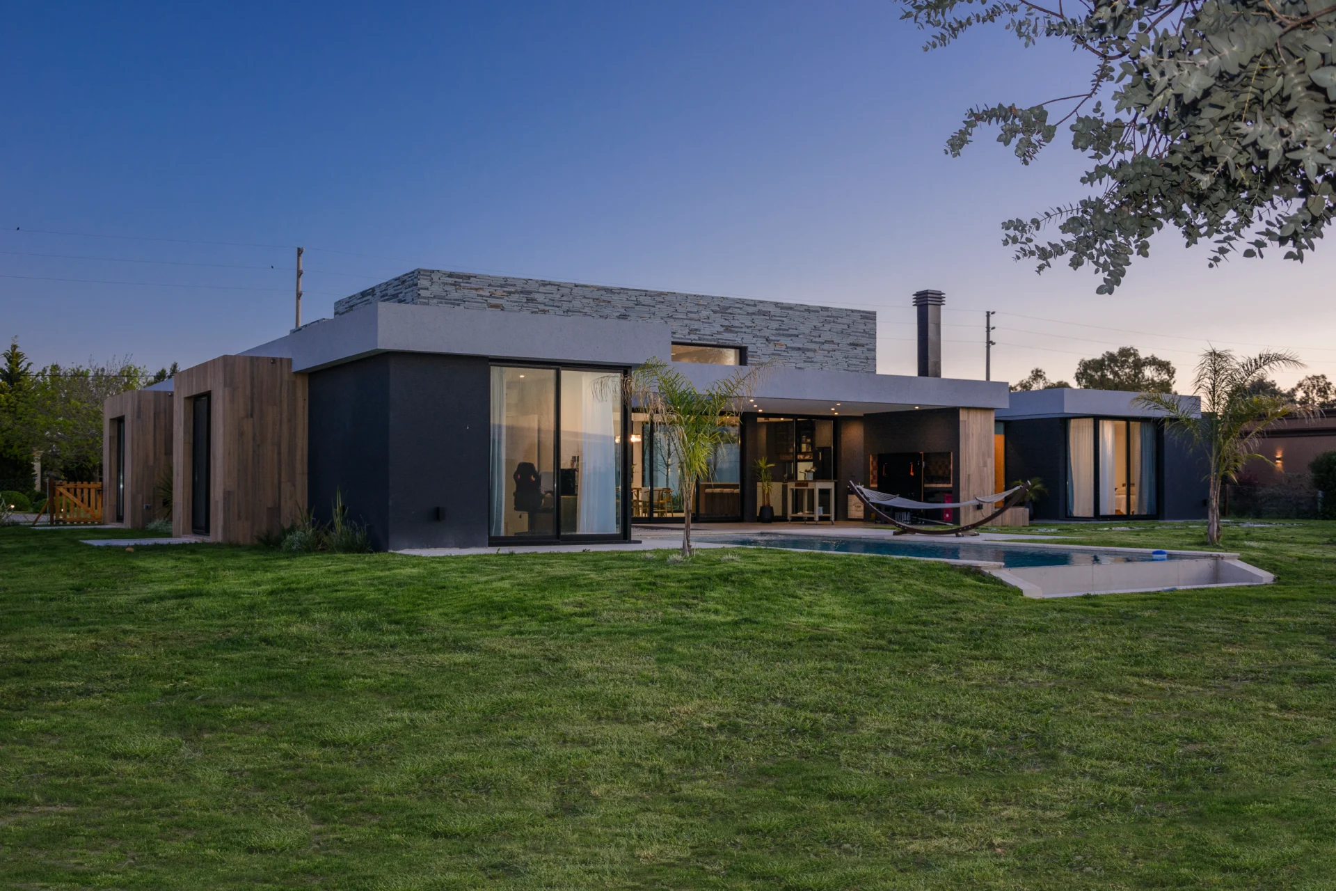 El proyecto combina materiales que enfatizan la calidez y modernidad, incluyendo revestimientos de piedra, madera y paredes negras. Los cerramientos acristalados refuerzan la sensación de amplitud y conexión exterior, mientras que los volúmenes de madera aportan textura y contrastan con la continuidad de la viga.