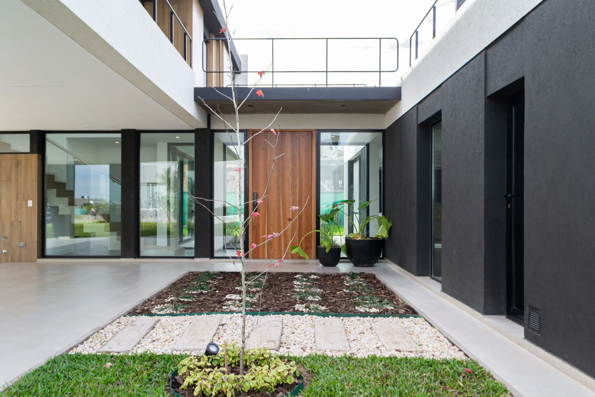 En lugar de enfatizar la típica puerta de acceso como punto focal en un primer plano, este diseño propone una secuencia espacial cuidadosamente elaborada. El ingreso se convierte en un trayecto pausado y contemplativo, que comienza con un semicubierto que da paso a un patio de bienvenida. Este espacio exterior está vinculado a un hall de acceso que conecta directamente con un segundo patio, configurando un recorrido fluido y natural que divide funcionalmente la vivienda en dos bloques.