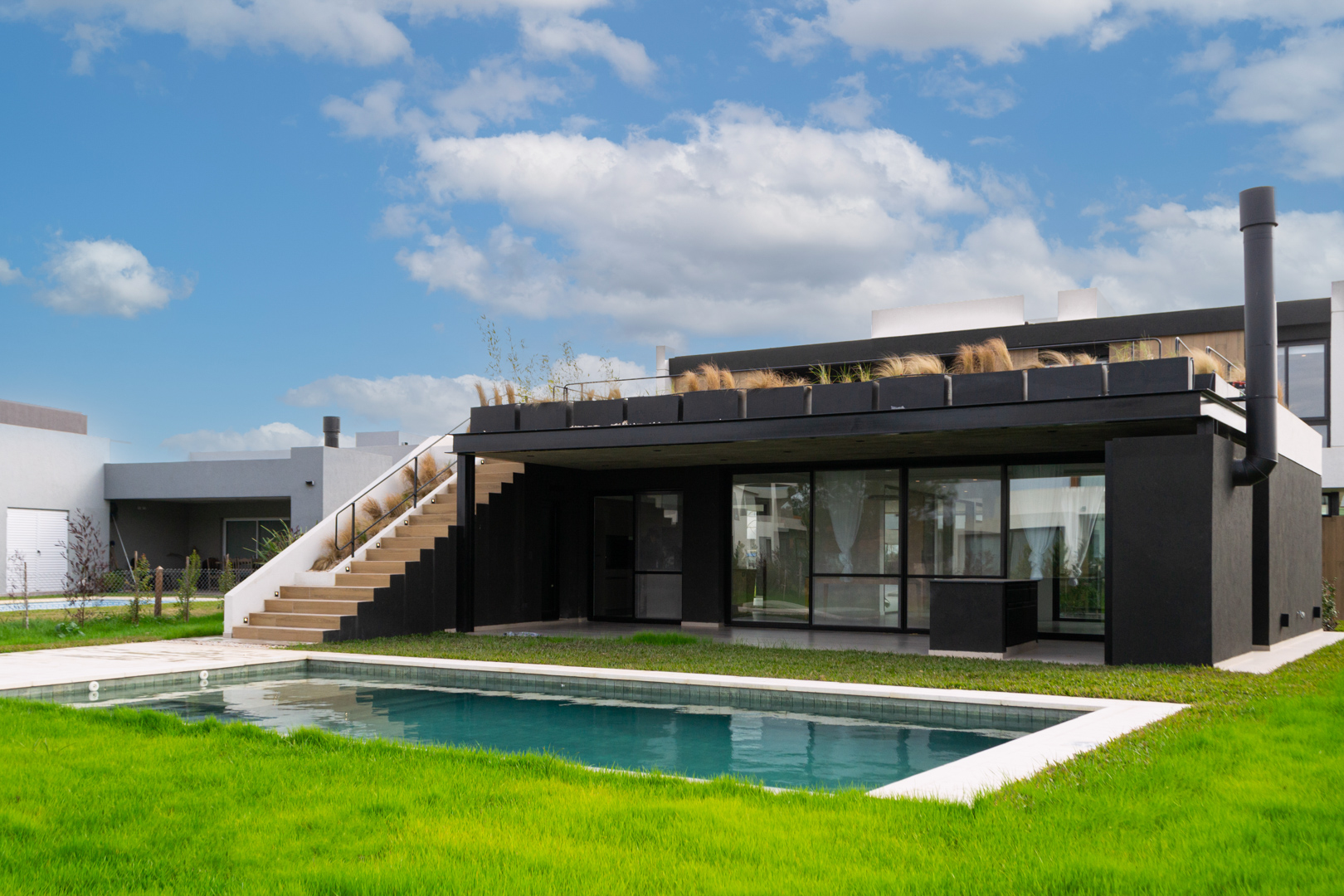 En el bloque posterior se desarrolla el área pública y de servicios, que incluye un estar-comedor, una galería, la cocina, el lavadero y un baño exterior. Por su parte, el bloque frontal contiene una habitación y un baño en planta baja, pensados para ofrecer flexibilidad en el uso de los espacios.
